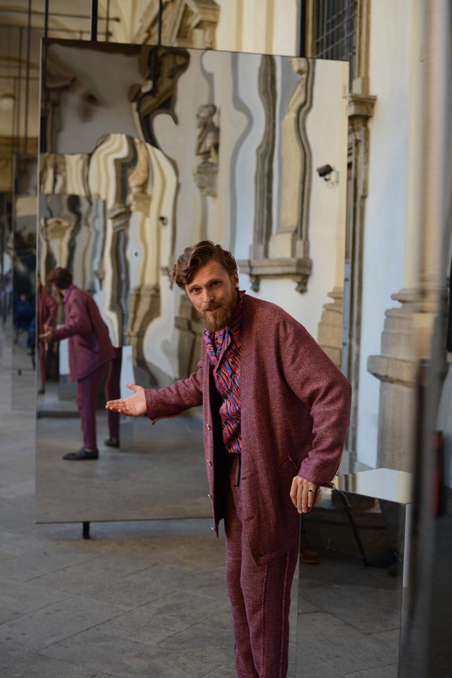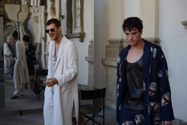 La direttrice creativa del marchio del Levriero ha ancora una volta dato spazio ai giovani artisti emergenti: gli attori sono stati scelti con uno street casting per interpretare gli archetipi maschili contemporanei. Gli abiti della collezione SS 2017 hanno così preso vita indossati da personaggi in cerca d’autore, che si muovevano riflessi da una serie di specchi, coinvolgendo anche il pubblico che assisteva alla performance e ponendo domande sull’identità maschile, esposta, analizzata, ironizzata e umanizzata.