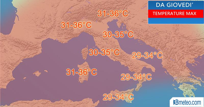 DA MERCOLEDI’ PICCHI DI 35-36°C – Saranno le regioni centro settentrionali più coinvolte dall’anticiclone che manterrà ancora lontane le perturbazioni. Si aggraverà quindi il problema della siccità. Già entro martedì si torneranno a raggiungere punte di 32/34°C sulla Valpadana e in Toscana, mentre le coste e in generale il Sud Italia vedranno temperature più basse, con clima ancora gradevole. Da giovedì il caldo tornerà a farsi intenso al Centronord con picchi di oltre 34/36°C sulle aree interne e in generale sulla Pianura Padana. Anche l’afa sarà in aumento in particolare nei grossi centri urbani e durante le ore serali, con temperature percepite talora di oltre 36-38°C.