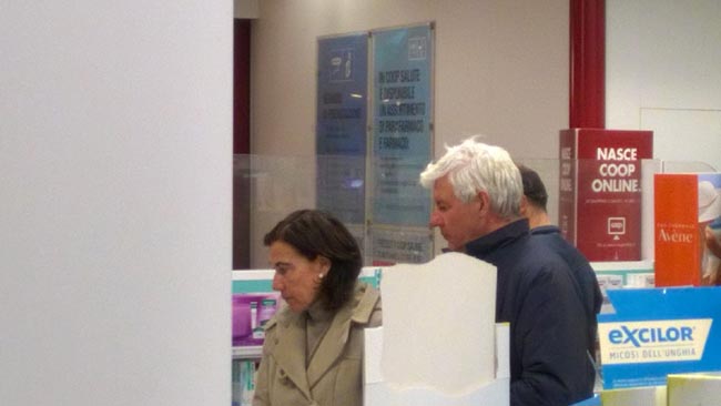 Una sosta alla parafarmacia, uno sguardo ai calzini e poi, un po' di cattivo umore ma con un'abbronzatura da skipper, Profumo alla fine getta nel carrello solo un giornale. Alla spesa ci pensa la signora.