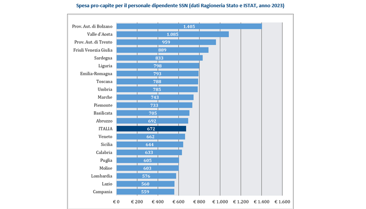 Con riferimento alla spesa sanitaria 2023 la spesa pro-capite per il personale dipendente nel 2023 è stata di 672 euro, con differenze significative tra le regioni: dai 1.405 euro nella Provincia autonoma di Bolzano a 559 in Campania.