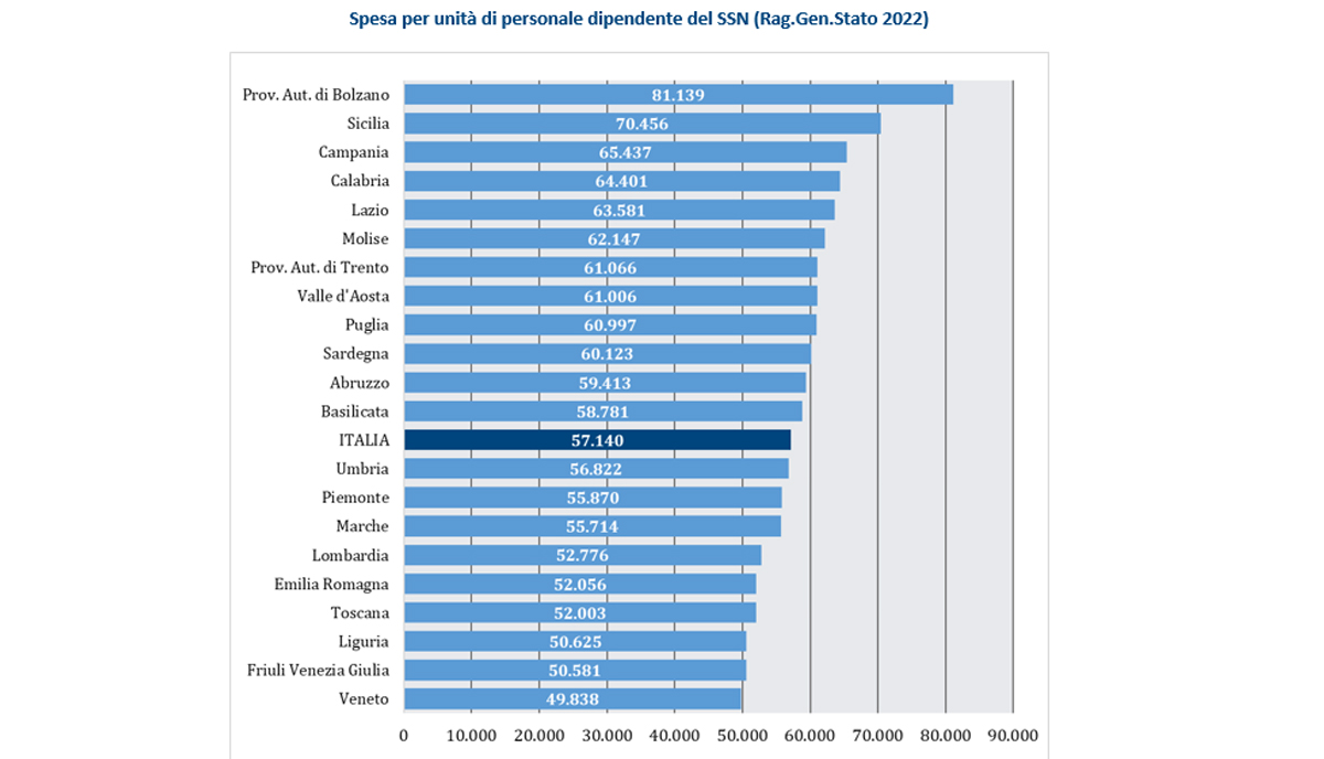 Per l’anno 2022, mettendo in correlazione le unità di personale dipendente con la spesa pubblica totale, la spesa per unità di personale a livello nazionale è pari a 57.140 euro, con 49.838 euro nel Veneto a 81.139 euro nella Provincia autonoma di Bolzano. Tutte le Regioni sottoposte a Piano di rientro (praticamente tutte quelle del Sud, ad esclusione della Basilicata) mostrano paradossalmente valori superiori alla media nazionale.