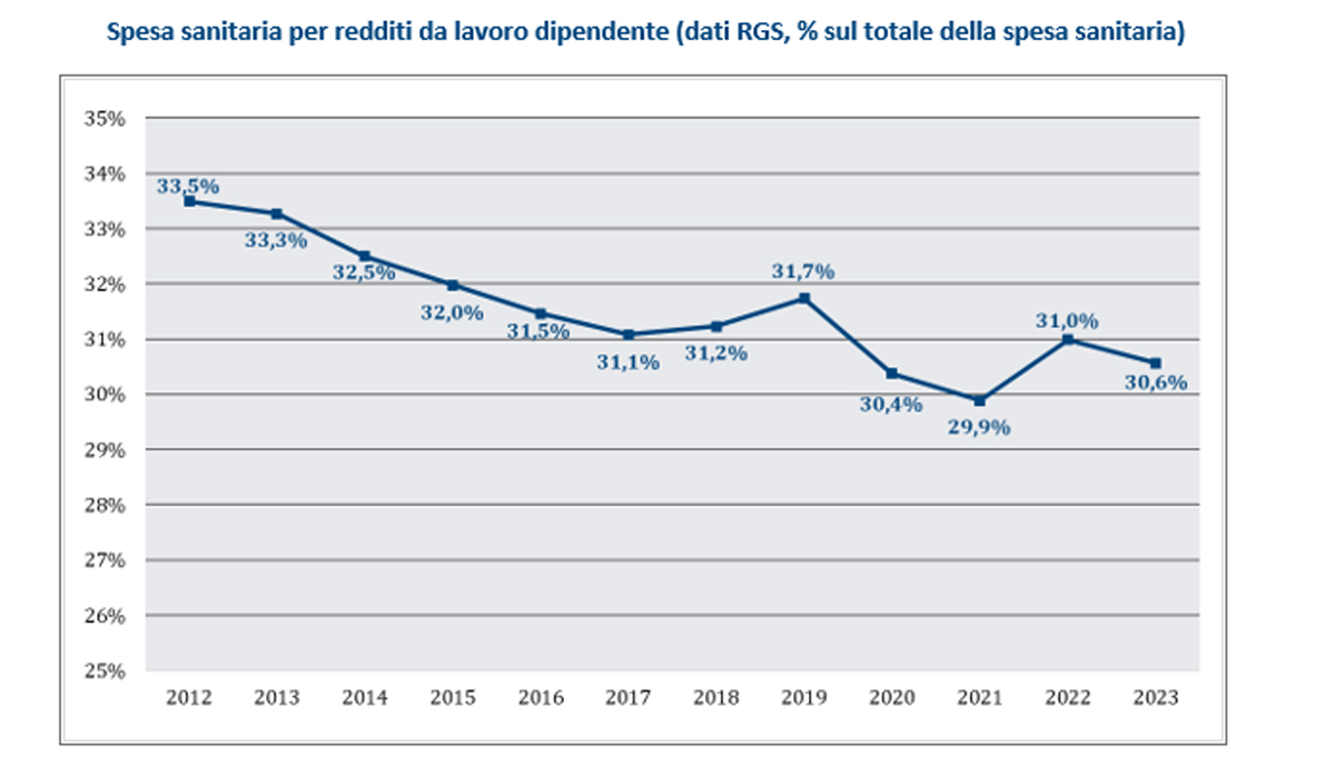 Tuttavia, in termini percentuali sulla spesa sanitaria totale, il trend rileva una lenta ma costante riduzione: se nel 2012 rappresentava il 33,5%, nel 2023 si è attestato al 30,6%. «Se la spesa per il personale dipendente si fosse mantenuta ai livelli del 2012, quando rappresentava circa un terzo della spesa sanitaria totale, negli ultimi 11 anni il personale dipendente non avrebbe perso 28,1 miliardi, di cui 15,5 miliardi solo tra il 2020 e il 2023, un dato che evidenzia il sacrificio economico imposto ai professionisti del SSN», ha commentato Cartabellotta.