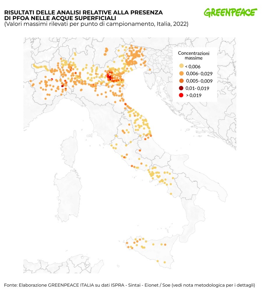 Greenpeace ha basato le sue conclusioni su un’analisi dei dati raccolti in un database dell’Istituto Superiore per la Protezione e la Ricerca Ambientale (ISPRA), i quali comprendono i risultati delle analisi svolte dalle Agenzie Regionali per la Protezione Ambientale (ARPA) tra il 2019 e il 2022.