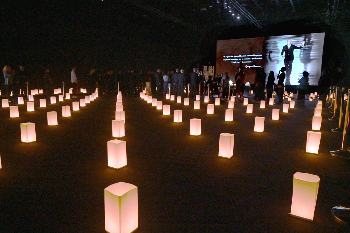 Armani: nella camera ardente teatro al buio e un tappeto di lanterne