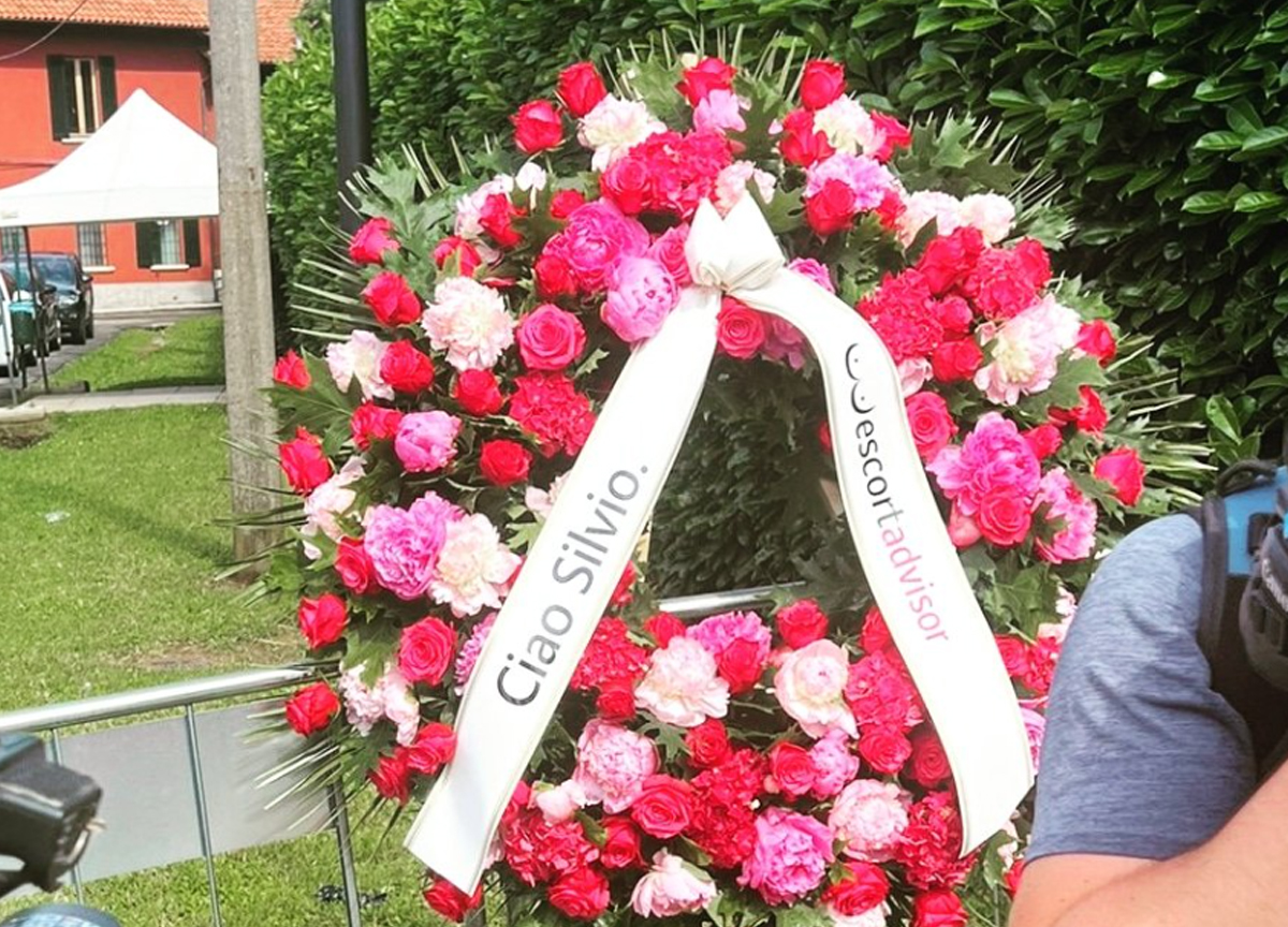 La storica residenza di Silvio Berlusconi ad Arcore è stata invasa da striscioni di commiato e omaggi. Uno tra questi ha attirato particolarmente attenzione, nonostante l’esposizione al pubblico sia “durata” poco. Si tratta di una corona di fiori che il sito Escort advisor ha voluto far recapitare in segno di affetto al defunto ex premier.