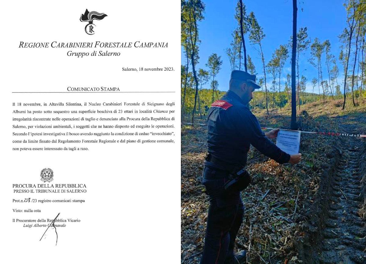 "Il Nucleo Carabinieri Forestale di Sicignano degli Alburni”, scrivono gli inquirenti, “ha posto sotto sequestro la superficie boschiva di 23 ettari in località Chianca per irregolarità riscontrate nelle operazioni di taglio e denunciato alla Procura della Repubblica di Salerno, per violazioni ambientali, i soggetti che hanno disposto ed eseguito le operazioni”.