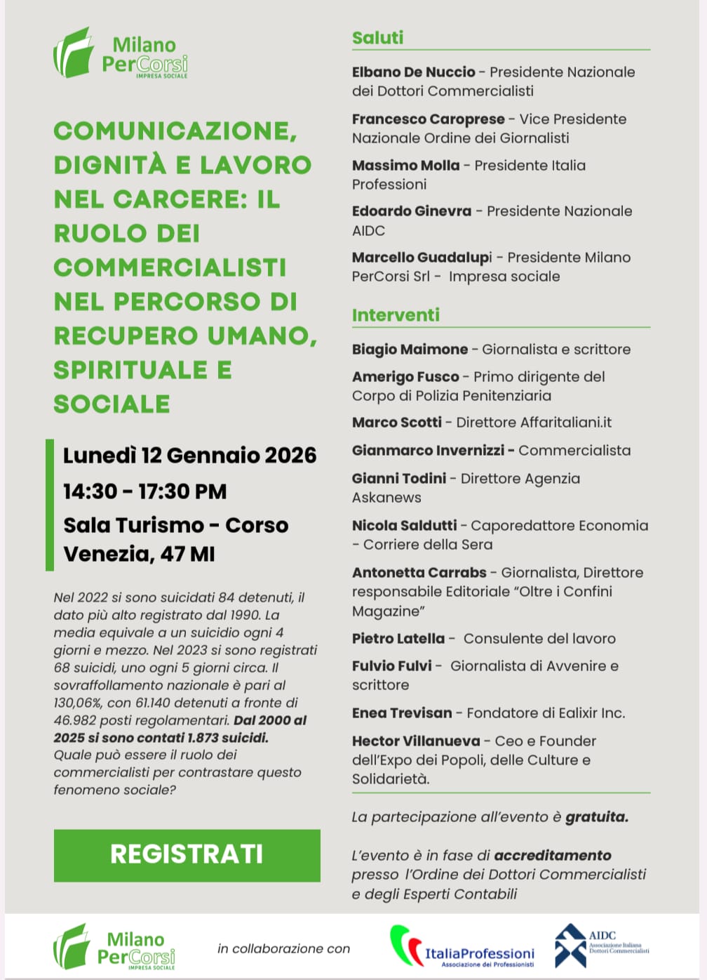 Su questi temi si concentrerà la conferenza nazionale "Comunicazione, dignità e lavoro nel carcere: il ruolo dei commercialisti nel percorso di recupero umano, spirituale e sociale", in programma lunedì 12 gennaio 2026 dalle ore 14.30 alle 17.30 presso la Sala Turismo della Sede di Confcommercio in Corso Venezia 47 a Milano.