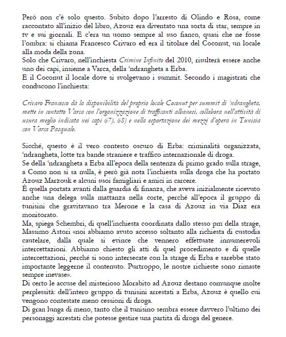 Il secondo capitolo di cui pubblichiamo i passaggi si intitola “Erba, crocevia della droga”, e affronta la pista mai battuta seriamente sulle implicazioni di un traffico di stupefacenti e sul coinvolgimento di Azouz, il marito e padre di due delle vittime, nella criminalità organizzata del paese.