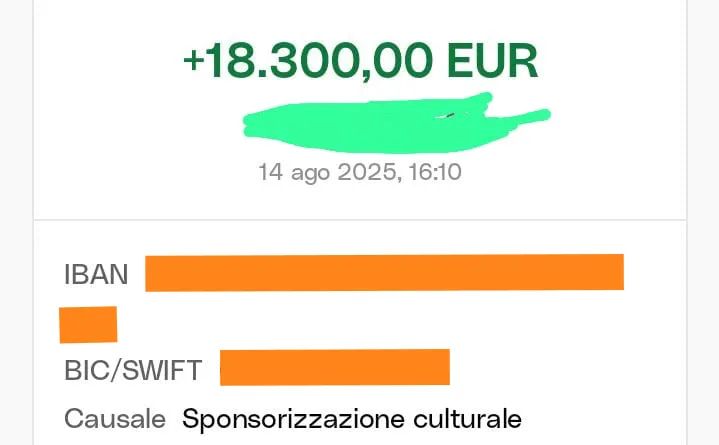 Eccoci al punto. I famosi soldi. Quelli che hanno fatto esplodere lo scandalo. Elena Zhou - o meglio, qualcuno per lei - ha versato 18.300 euro (15.000 più IVA) sul conto di Stramandino. Questo è un fatto. C'è il bonifico, Stramandino stesso l'ha confermato mandandomi lo screen: "15.000 più IVA con bonifico intestato a me, totale 18.300 euro". Ma per cosa? Qui le versioni divergono completamente.