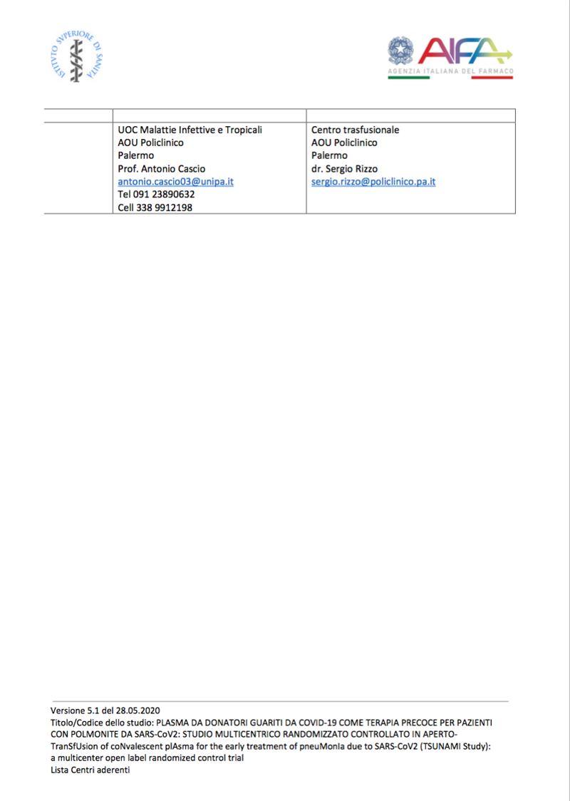 Dopo il successo del plasma iperimmune e la relativa risonanza mediatica come terapia antiCovid è stato autorizzato dal Comitato Etico dell’INMI “L. Spallanzani” lo studio TSUNAMI (acronimo di TranSfUsion of coNvaleScent plAsma for the treatment of severe pneuMonIa due to