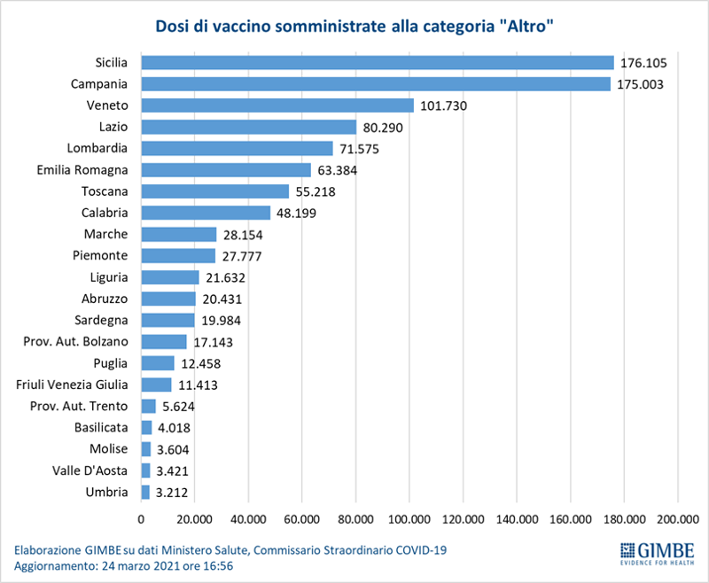 In Italia la doppia dose di vaccino è stata somministrata (alla data di ieri) a 2 milioni e 624mila e 201 persone. Parliamo del 4.4% della popolazione che ha completato il ciclo vaccinale con marcate differenze regionali – come ammoniva ieri il presidente del Consiglio Mario Draghi – dal 3,4% di Sardegna e Calabria al 5,7% del Friuli-Venezia Giulia. È quanto emerge dal monitoraggio indipendente della Fondazione Gimbe presieduta da Nino Cartabellotta. “Sul fronte AstraZeneca – spiega Renata Gili, Responsabile Ricerca sui Servizi Sanitari di Gimbe – nessun contraccolpo dopo lo stop della scorsa settimana: infatti, nelle giornate di domenica 21, lunedì 22 e martedì 23, il numero di somministrazioni ha superato quello dei giorni corrispondenti della settimana precedente”.
