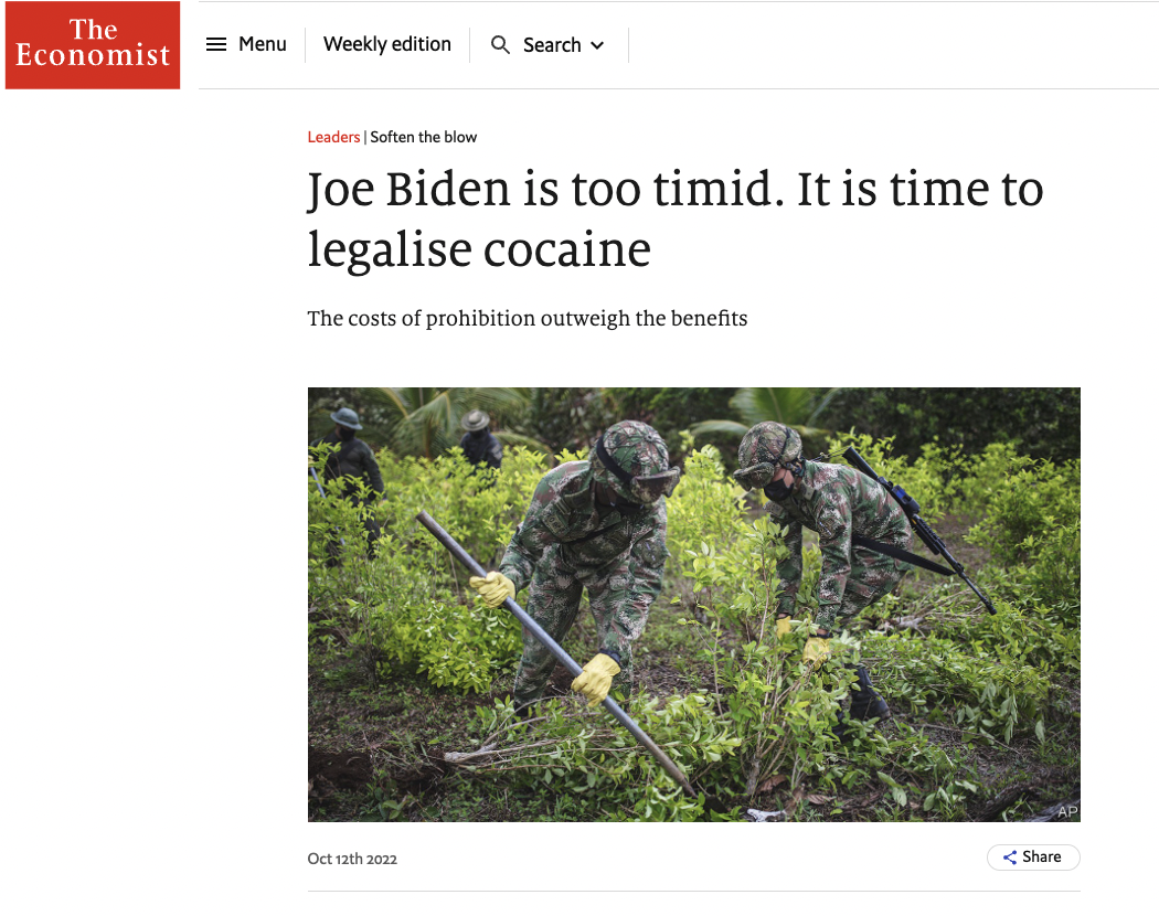 In sostanza avere la cocaina come merce illegale non fa che avvantaggiare la criminalità organizzata e rendere ancora meno sicuro lo stupefacente. La proposta della rivista: “La vera risposta è la piena legalizzazione, che consente ai non criminali di fornire un prodotto rigorosamente regolamentato e altamente tassato, proprio come fanno i produttori di whisky e sigarette. (La pubblicità dovrebbe essere vietata)”.