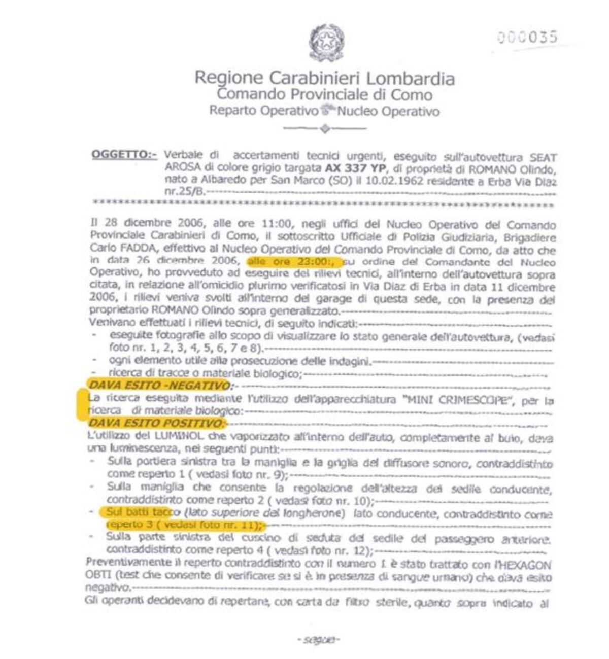 Beh, consideri che la traccia – che pur viene descritta come “corposa” - non è stata individuata nell’immediatezza, ma solo 15 giorni dopo la prima ispezione della vettura. E che l’auto, per tutto quel tempo, è rimasta nella disponibilità dei coniugi Romano, che l’hanno potuta utilizzare e inquinare in ogni modo. E che la macchia di sangue non solo non è stata rilevata a occhio nudo, ma neppure – come riporta il verbale – con la tecnologia del “mini – crimescope”, che è molto all’avanguardia. Solo con il “luminol” (tecnica altamente criticabile, ndr) si è rinvenuta.