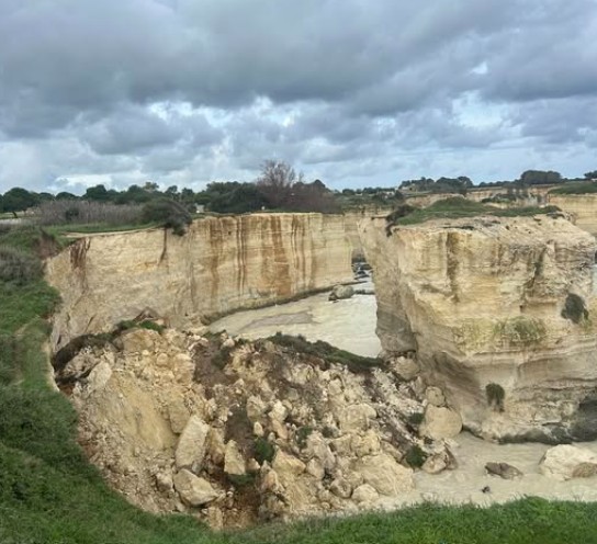 Uno dei luoghi più suggestivi del Salento, l'Arco di Sant'Andrea in zona Pepe a Melendugno, in provincia di Lecce, è crollato questa notte dopo giorni di piogge e vento forti che hanno colpito la zona. Si tratta di una falesia, una sorta di sperone, che si trova in mare davanti a un costone roccioso alto cui era collegato con una sorta di ponte naturale che stanotte è venuto giù. Un'area esposta alle mareggiate e al vento e peraltro infiltrato dall'acqua. Ieri sera la zona tra Sant'Andrea e Torre dell'Orso e la stessa cittadina di Melendugno è stata interessata da piogge forti, simili a una grandinata, fulmini e vento. "E' un colpo al cuore durissimo - ha commentato il sindaco Maurizio Cisternino -Sparisce uno dei tratti turistici piu famosi della nostra costa e dell'Italia intera. La Wind lo scelse tra i suoi primi spot".