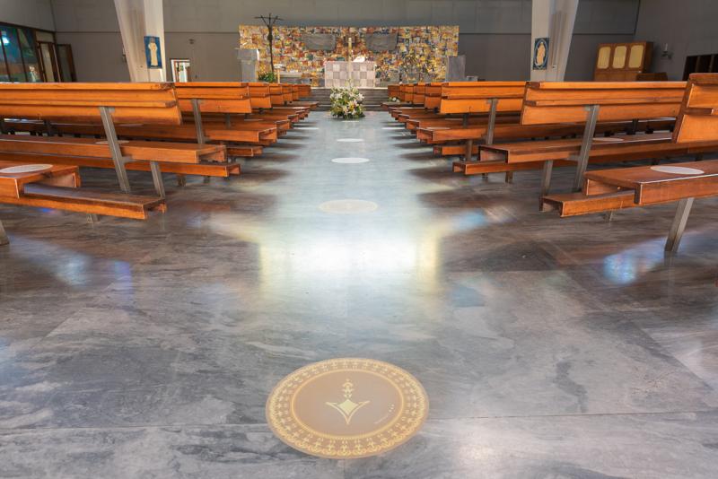 A ogni ingresso della Chiesa della Santissima Trinità è stato associato un diverso colore che va a regolare tutto il flusso di movimenti autorizzati ai fedeli entrati da quell’accesso. Da ogni singolo ingresso potrà transitare solo un numero predefinito di fedeli ai quali è riservato un determinato numero di posti a sedere e in piedi. Il numero dei fedeli viene tenuto monitorato dall’utilizzo dei conta persone.