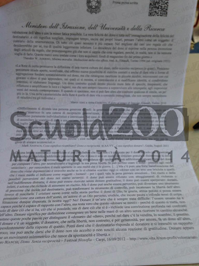 E’ Salvatore Quasimodo l’autore proposto nella traccia della prova di Italiano alla maturita’. Del poeta siciliano vengono sottoposti agli studenti i versi “Ride la gazza nera sugli aranci”, dalla raccolta “Ed è subito sera”. Seguono il tema dell’Europa e la violenza. In classe mezzo milione di studenti. Il codice di accesso per “decriptare” le tracce per il primo scritto dell’esame è stato letto dal ministro dell’Istruzione, Stefania Giannini, in diretta dal Tg1. Abbinandolo a quello già in loro possesso, le commissioni hanno subito “scaricato” i temi da proporre ai maturandi.