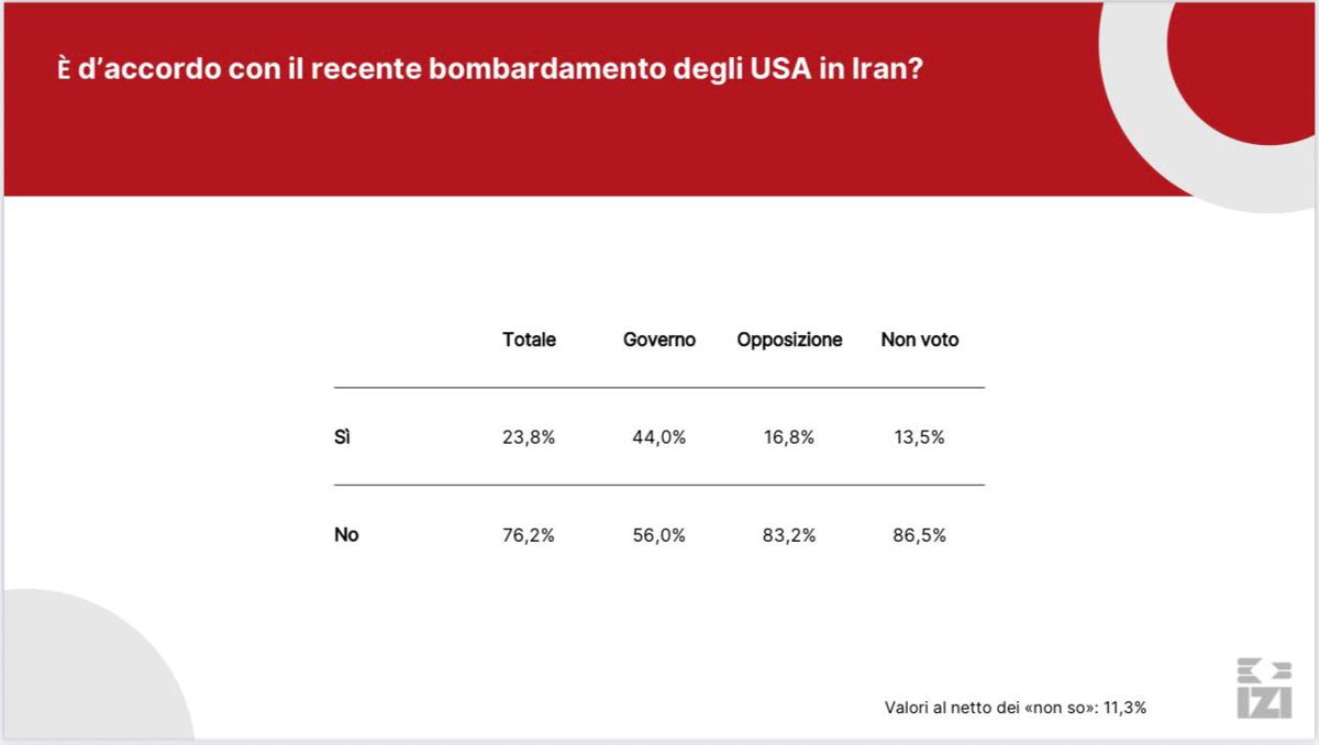 Tre italiani su quattro disapprovano l’intervento degli Stati Uniti in Iran. È quanto emerge da un sondaggio Izi, società specializzata in analisi economiche e politiche, presentato questa mattina nel corso della trasmissione L’aria che tira su La7. I dati, rilanciati da LaPresse, mostrano come il 75% degli intervistati condanni l’operazione statunitense, con un’opposizione che supera l’80% tra chi si colloca all’opposizione o nell’area del non voto.