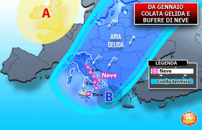 Antonio Sanò, direttore e fondatore del sito www.iLMeteo.it avverte che i gelidi venti soffieranno fortissimi sul medio e basso Adriatico, sul Tirreno e sullo Ionio e saranno forieri di nevicate fin su coste e pianure di Marche, Abruzzo, Molise, Puglia e Basilicata e possibili anche sulla Sicilia settentrionale e in Calabria. Con i venti forti, la neve cadrà sotto forma di bufera a partire da Giovedì 3 e poi Venerdì 4 Gennaio. Per quanto riguarda invece le temperature, si registrerà un crollo termico di 15°C con valori massimi di 0-2°C su tutto il Sud, fino a 5°C a Roma e sul resto del Nord. Gelate notturne intense al Nord con -6°C in pianura, fino a -25°C a 2500 metri e valori sottozero anche sul resto d’Italia.
