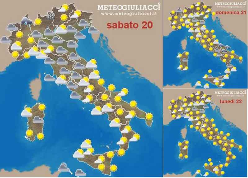 Ma alla fine del giorno nevicate fino a bassa quota sulle Alpi di confine per un nucleo di aria polare marittima (quindi freddo mite) il quale poi domani, domenica 21, scivolerà verso i Balcani, lambendo però anche le regioni adriatiche e il Sud ove porterà un calo temporaneo delle temperature e deboli piogge su Marche, Abruzzo, Molise, Puglia, Bassa Calabria, Nord Sicilia.