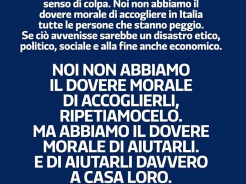 Nell'estate del 2017, in piena campagna di presentazione del libro "Avanti" (che doveva rappresentare il rilancio dell'immagine di Matteo Renzi dopo la sconfitta referendaria), il Pd pubblicava una card tratta dalle pagine dell'opera in questione contenente le seguenti parole: "Vorrei che ci liberassimo da una sorta di senso di colpa. Noi non abbiamo il dovere morale di accogliere in Italia tutte le persone che stanno peggio. Se ciò avvenisse sarebbe un disastro etico, politico e sociale e alla fine anche economico. Noi non abbiamo il dovere morale di accoglierli, ripetiamocelo. Ma abbiamo il dovere morale di aiutarli. E aiutarli davvero a casa loro".