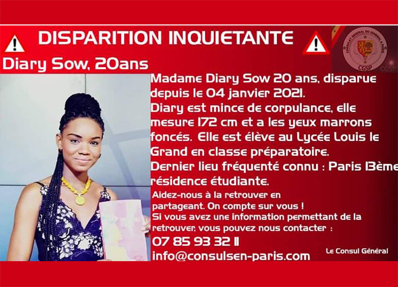 Merci de maintenir l’extraordinaire élan de solidarité afin de la retrouver saine et sauve #RetrouvonsDiarySow #retrouvonsds @kebetu @RokhayaDiallo @OmarSy @HapsatouSy @BeyeHabib pic.twitter.com/jka57P6mG7— Consulat Sénégal (@ConsulSenParis1) January 10, 2021
