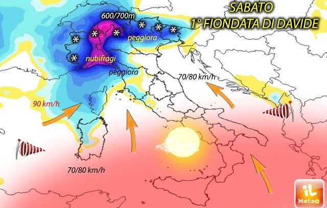 Sabato la prima fiondata del ciclone Davide porterà maltempo su Liguria, Lombardia, Alpi, Prealpi, Toscana e poi anche su Umbria e Lazio; temporali sulle regioni centrali; neve abbondante sopra i 600 metri sulle Alpi; nubifragi su Liguria di Levante e alta Toscana; piogge diffuse sulla Pianura Padana e rischio acqua alta a Venezia, con una stima di circa 110 cm.