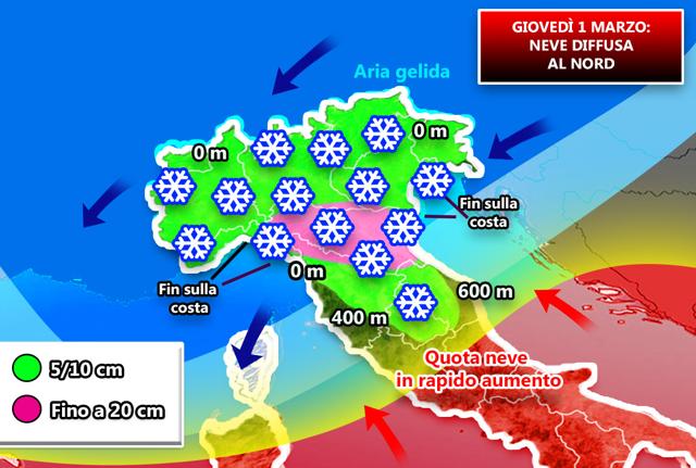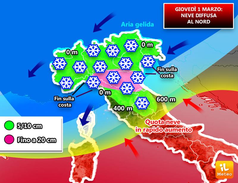 iLMeteo avvisa che da Mercoledì pomeriggio giungerà una perturbazione atlantica che porterà la tanto attesa e diffusa neve anche al Nord. L’ultimo giorno di Febbraio inizierà a nevicare in Liguria fin sulle coste, in Piemonte e poi in Lombardia. Tanta neve a Milano, Bergamo, Brescia, Mantova, Cremona, Genova, Savona, Padova, Venezia, Bologna, Modena… Nevicherà in Toscana, come a Firenze.
