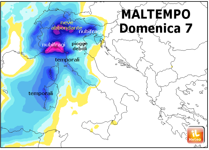 L’alta pressione diventerà un ricordo almeno per i prossimi 10/15 giorni, infatti da domenica 7 febbraio, un treno di perturbazioni raggiungerà l’Italia e il primo vagone, carico di pioggia e neve è atteso proprio per il weekend di Carnevale. La redazione web del sito www.iLMeteo.it avvisa che il tempo inizierà a peggiorare da sabato pomeriggio con le prime piogge che interesseranno la Liguria e il Piemonte. Nel corso di domenica 7 piogge diffuse interesseranno gran parte del Nord, temporali e possibili nubifragi si abbatteranno su tutta la Liguria, l’alta Toscana, Alpi e Prealpi. Temporali sulle coste occidentali della Sardegna. Neve abbondante sulle Alpi sopra i 900/1000 metri con accumuli fino a 30 cm a 1000 m, sopra i 60 cm a 1500 metri.