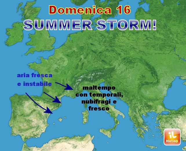 Si invita a prestare attenzione ai fenomeni particolarmente pericolosi per l’uomo! Calo termico generale con sapori d’autunno, crollo delle temperature massime che non supereranno i 22° su gran parte d’Italia. Antonio Sanò, direttore e fondatore del sito www.iLMeteo.it ci comunica che il tempo inizierà a cambiare già da oggi, specie al Nordovest con rovesci e temporali, e nubi irregolari interessano anche le coste emiliane con piogge sparse. Sabato piogge sparse, ma diffuse su gran parte del Nord e temporali ancora su Alpi, Prealpi, Piemonte e Lombardia. Domenica, come detto, arriverà Summer Storm. Con l’inizio della prossima settimana il tempo migliorerà gradualmente, ma nuovi temporali sono attesi al Nord per mercoledì 19.