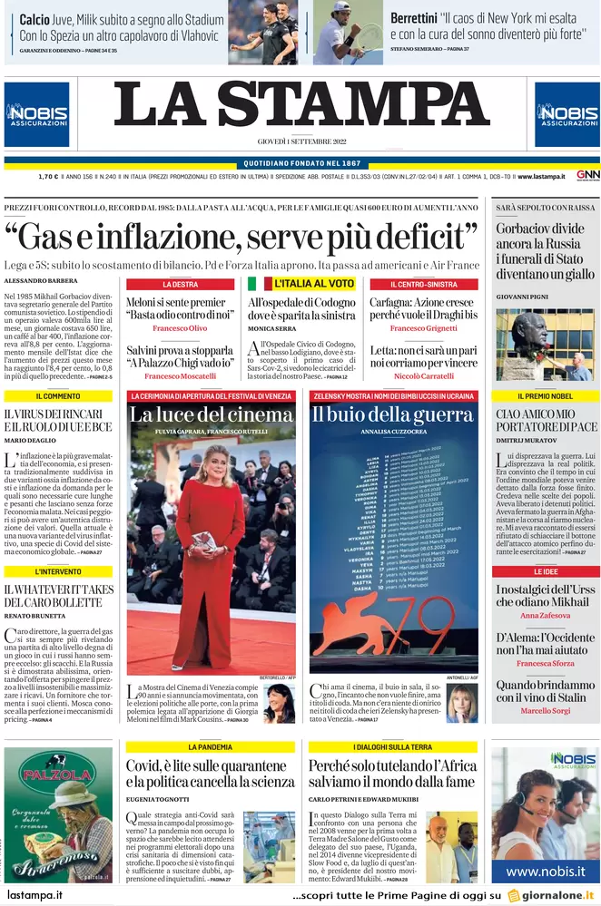 Scopri qui tutte le prime pagine e le principali notizie dei quotidiani italiani per il giorno 1 settembre 2022