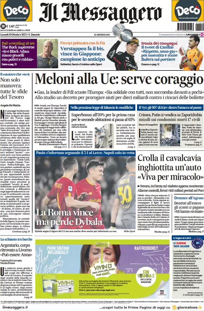 Prime pagine giornali 10 ottobre 2022. L'Ue secondo Meloni e caos sulle armi