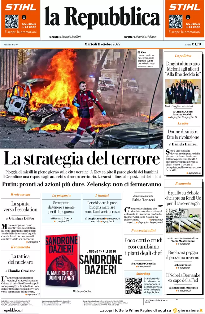Prime pagine giornali 11 ottobre 2022. Furia russa e debito comune Ue sul gas