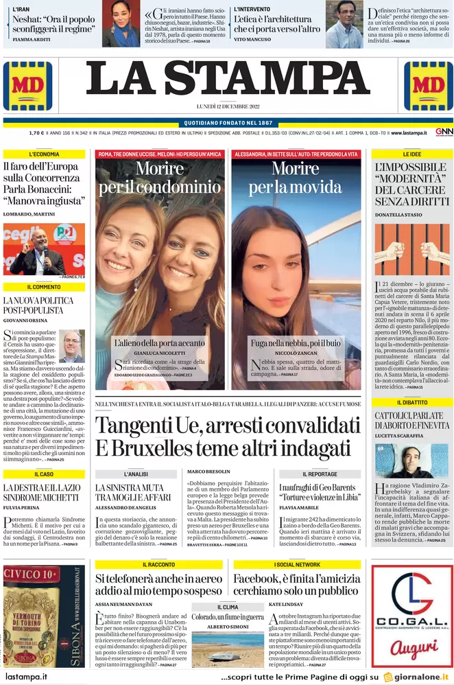 Prime pagine giornali 12 dicembre 2022. Tangenti Ue, ombre su altri 4 italiani