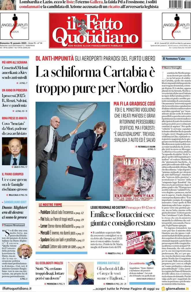 Prime pagine giornali 15 gennaio 2023. Tensione Fi-FdI. Cartabia: Nordio cede
