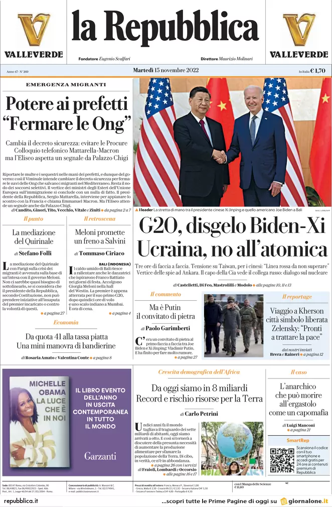 Prime pagine giornali 15 novembre 2022. Potere ai prefetti: "Fermare le Ong"