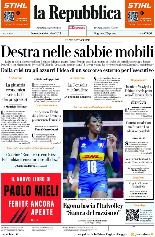 Scopri qui tutte le prime pagine e le principali notizie dei quotidiani italiani per il giorno 16 ottobre 2022