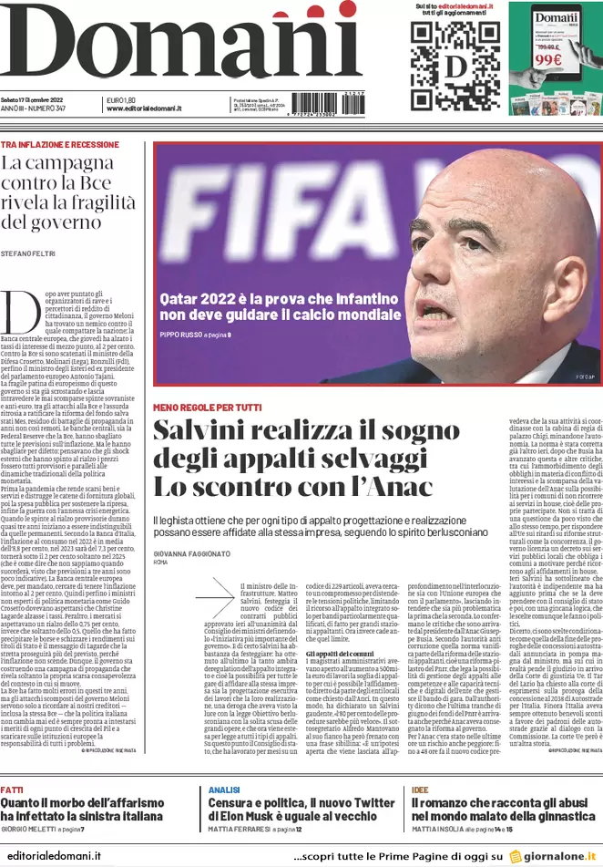 Scopri qui tutte le prime pagine e le principali notizie dei quotidiani italiani per il giorno 17 dicembre 2022