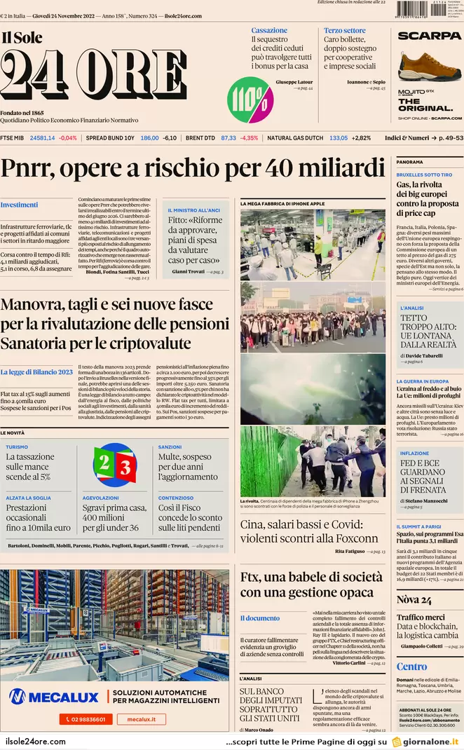 Prime pagine giornali 24 novembre 2022. Manovra, condono sulle criptovalute