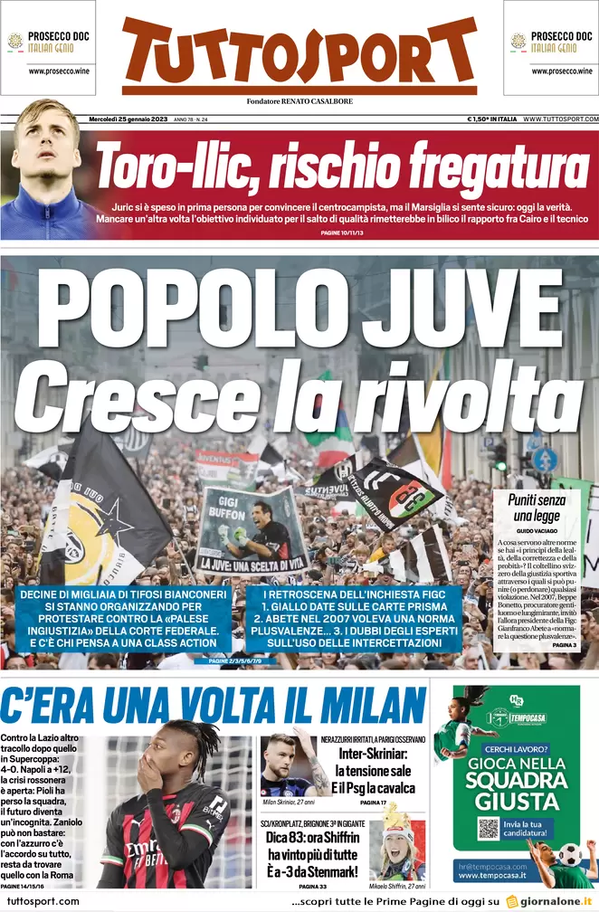 Di seguito le prime pagine dei principali quotidiani italiani per il giorno 25 gennaio 2023. CLICCA SULL’ELENCO QUI SOTTO PER LEGGERE TUTTE LE PRIME PAGINE