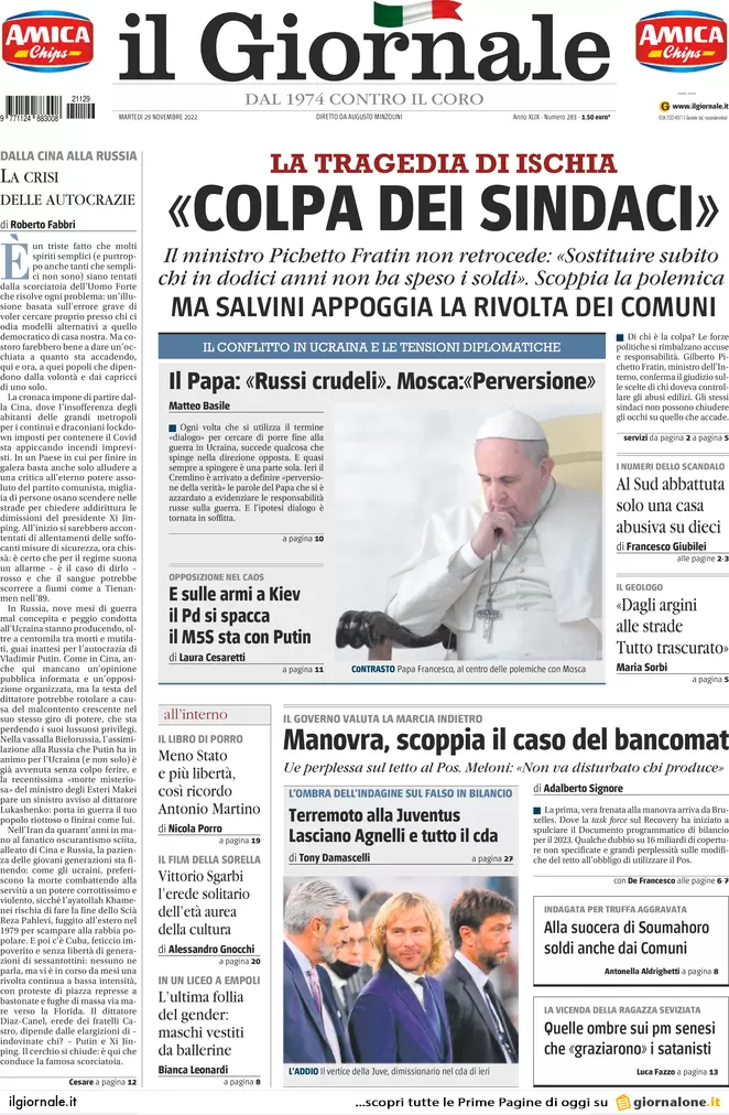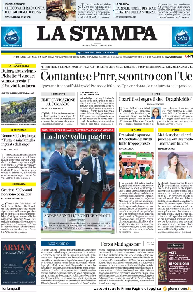 Scopri qui tutte le prime pagine e le principali notizie dei quotidiani italiani per il giorno 29 novembre 2022