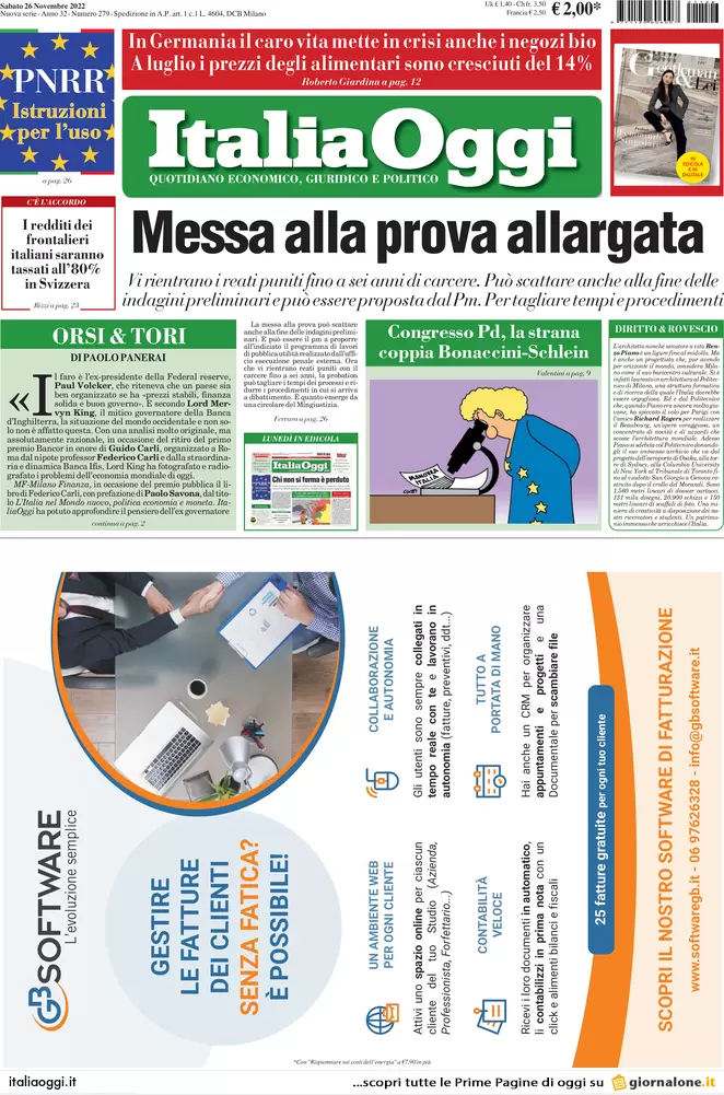 Scopri qui tutte le prime pagine e le principali notizie dei quotidiani economici italiani per il giorno 26 novembre 2022