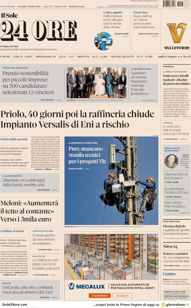 Scopri qui tutte le prime pagine e le principali notizie dei quotidiani economici italiani per il giorno 27 ottobre 2022