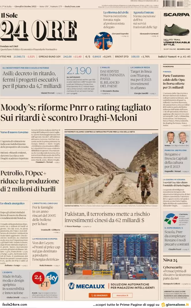 Prime pagine dei giornali economici 6 ottobre 2022