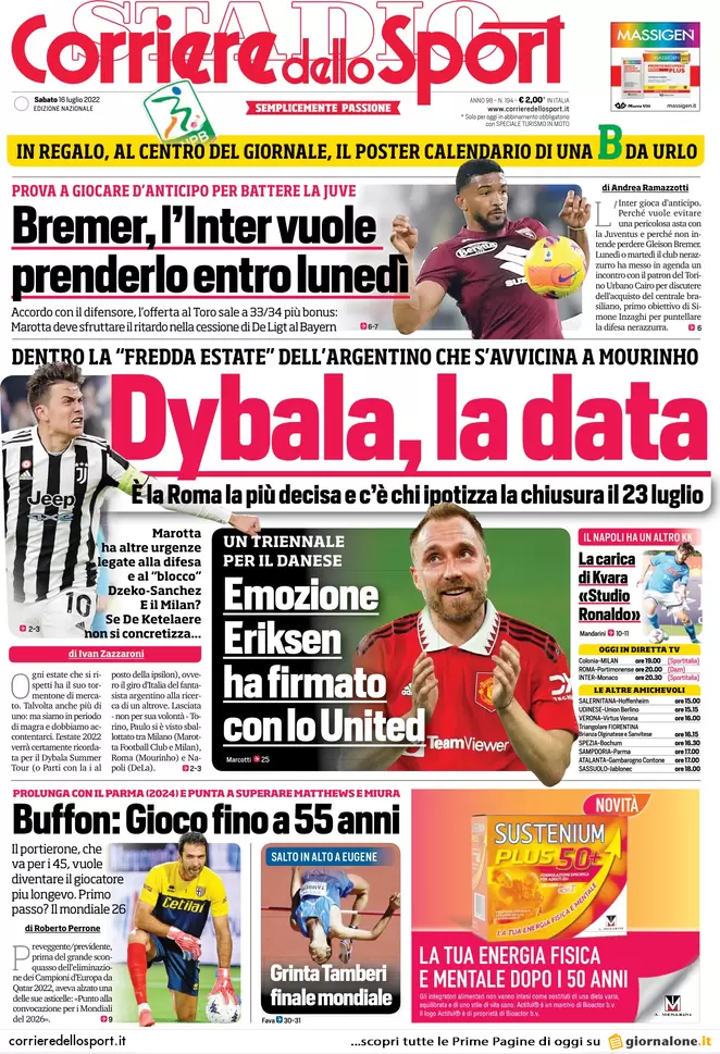 Prime pagine giornali sportivi 16 luglio. Dybala preme l'Inter, arriva Bremer