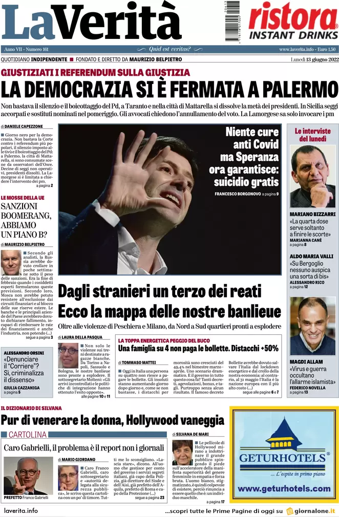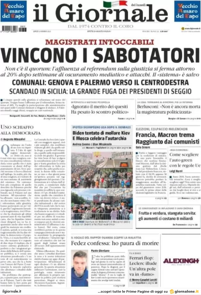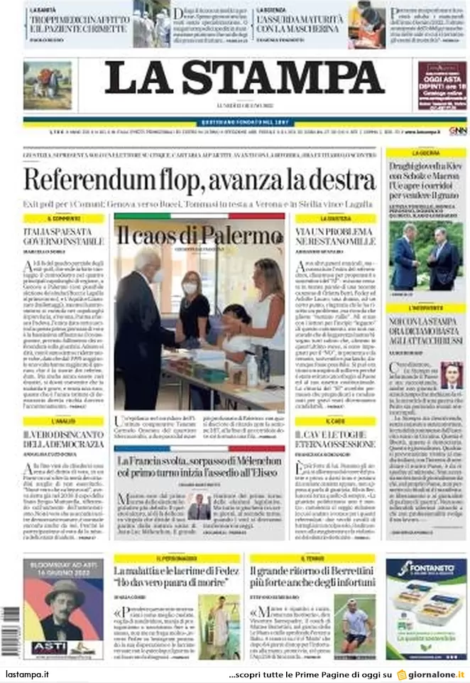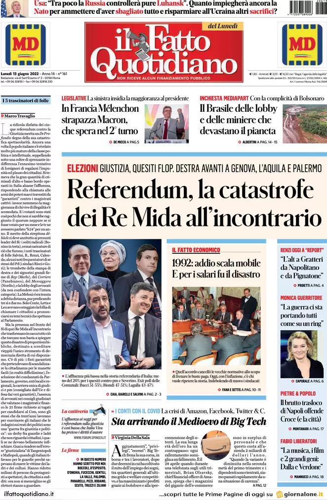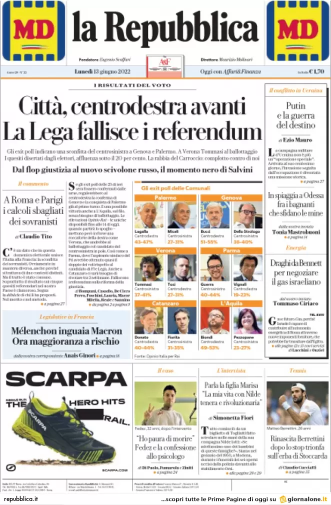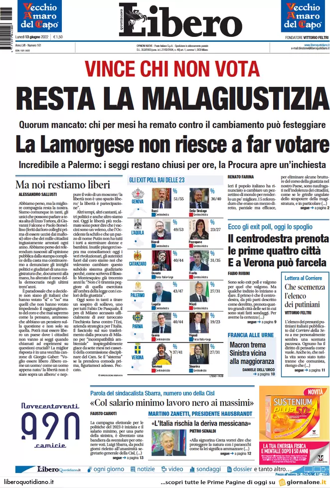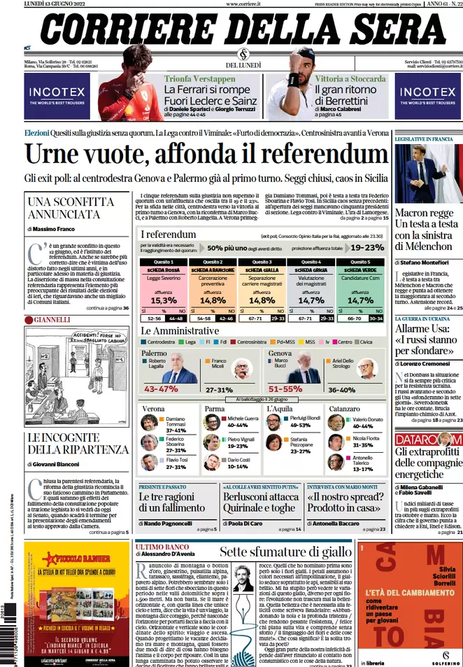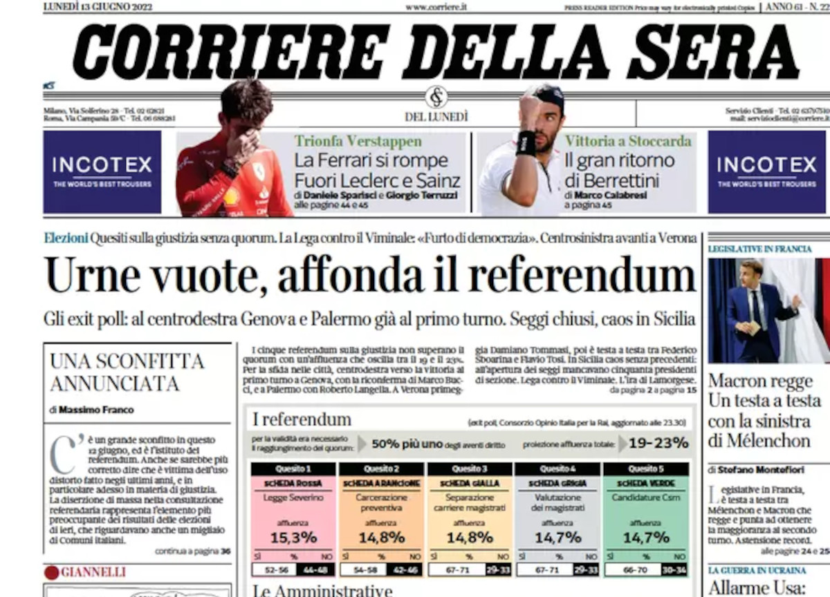 Prime pagine quotidiani 13 giugno 2022: referendum flop ed exit poll comunali