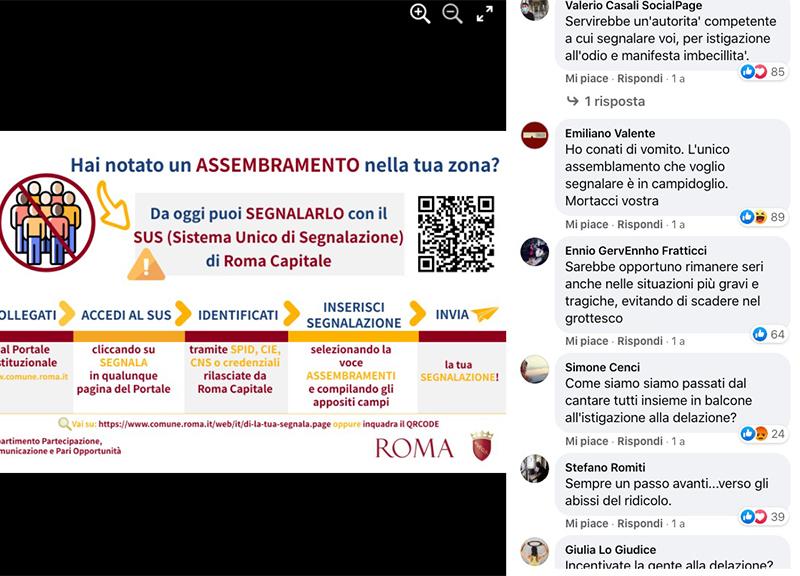 Ma anche considerazioni più posate, come quella di Nasrin M. che fanno riflettere sull’approssimazione dell’intervento pubblico della capitale: “Non vi rendete conto delle conseguenze di questa azione. Cosa ha di risolutivo? Dare la possibilità a persone nel panico di denunciare acriticamente irregolarità che magari non esistono. Sempre che non vi si intasi prima la piattaforma!”. O quella di Rosario D.: “Piantatela subito, non è trasformando metà dei cittadini in criminali e l’altra in delatori che si supera una emergenza grave come quella che stiamo vivendo”.