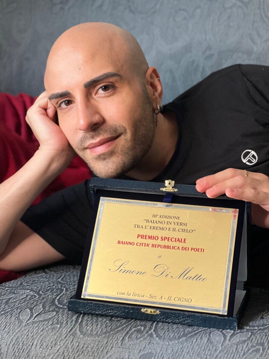 Ennesimo riconoscimento per Simone Di Matteo, l’irriverente giornalista e scrittore che, con il suo “canto del cigno”,si è aggiudicato il Primo Premio nel corso della III edizione del Festival della Letteratura e delle Arti Visive “Baiano in versi, tra l’eremo ed il cielo”, e un encomio speciale da parte dell’amministrazione comunale nonché del sindaco Dr. Enrico Montanaro per il prezioso contributo all’arricchimento del patrimonio letterario-artistico e culturale odierno.