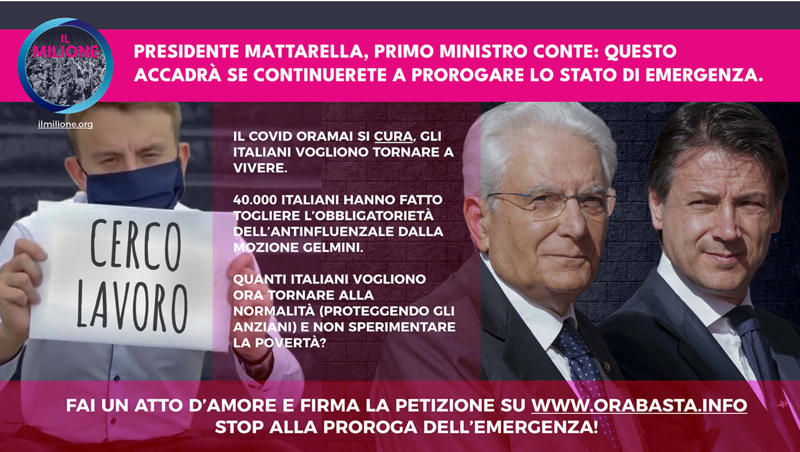 “Ora – scrivono ancora – in meno di 7 giorni abbiamo fatto firmare su www.orabasta.info 500.000 italiani che non vogliono la proroga dello stato di emergenza al 31.01.2021. Lasceremo la petizione aperta, siamo sicuri che molti altri cittadini firmeranno”.