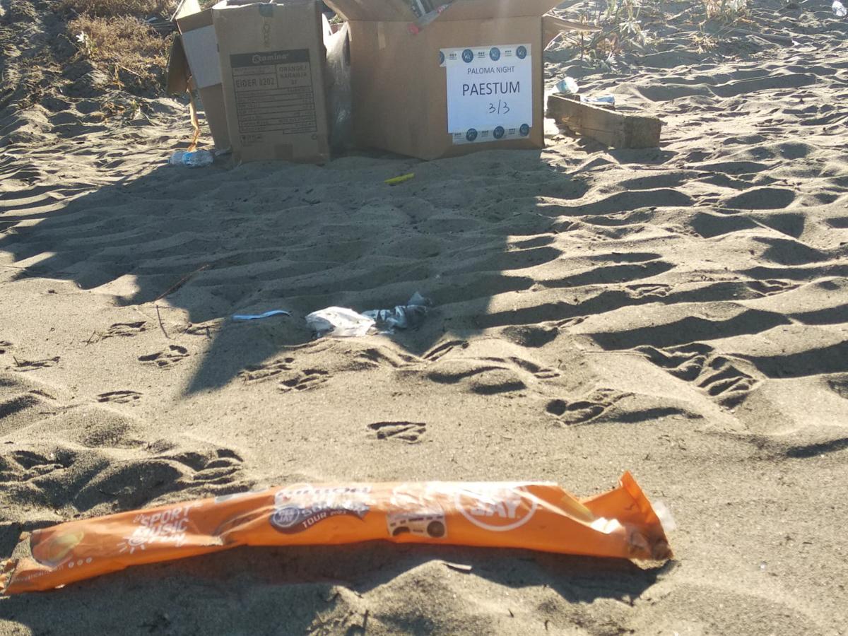 La mattina del 14 agosto ci aggiriamo tra la spazzatura e la sabbia della spiaggia di Paestum-Capaccio, dove è appena passato il Vertical Summer Tour di Bilboa, accompagnati dal sound estivo di Radio Deejay. Con un signore anziano del luogo proviamo a raccogliere la plastica sparsa tra resti di ogni tipo lasciati a ridosso del mare, persino tre infradito marcate Bilboa e poi bicchieri, lattine, fazzoletti, cicche di sigarette, strisce di cellophane da imballaggio, pallet di legno, spazzatura tra i gigli delle dune protetti, resti di plastiche finiti tra le onde. “Anche l’anno scorso era uno schifo così”, ci spiega l’anziano: “sono venuto apposta per vedere”. Finiamo di raccogliere e sistemiamo l’ombrellone dove dalla sabbia emergono meno “optional”.