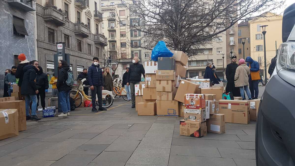 Un punto di raccolta di generi di prima necessità per l’Ucraina a Milano